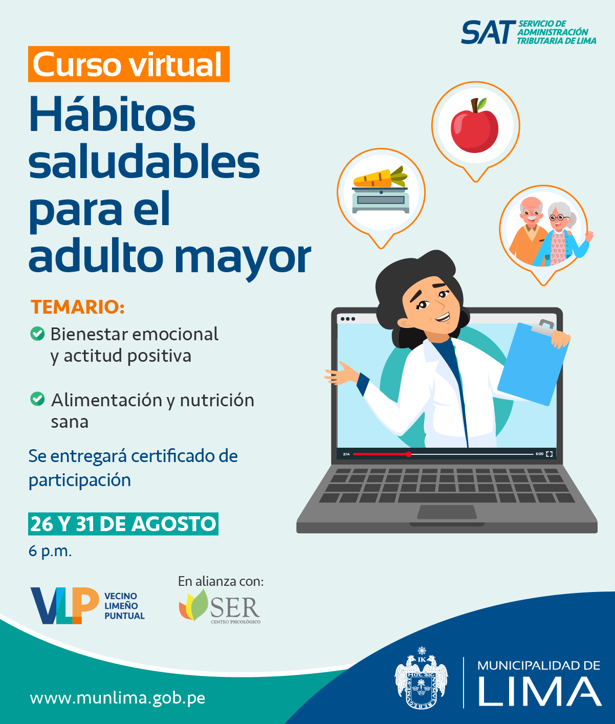 Lima, 19 agosto del 2021.- En el marco del Mes del Adulto Mayor, el Servicio de Administración Tributaria (SAT) de Lima dictará un curso virtual gratuito para que los adultos mayores adquieran hábitos saludables que les permitan tener una vida más sana y equilibrada.